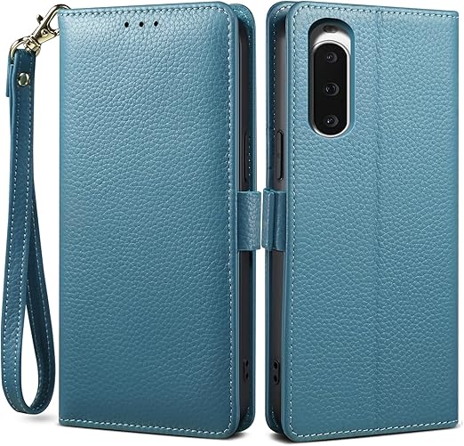 【2023 新登場! 高級シュリンクカーフレザー】Xperia 10 V ケース 手帳型 本革 牛革 カード収納 サイドマグネット式 横置きスタンド機能付き 上下にストラップホール付き ストラップ付 エクスペリア テン マークファイブ [au SOG11 docomo SO-52D 対応] ケース 柔軟なTPU素材 耐衝撃 全面保護[Noble Series](Xperia 10 V、シアン) a