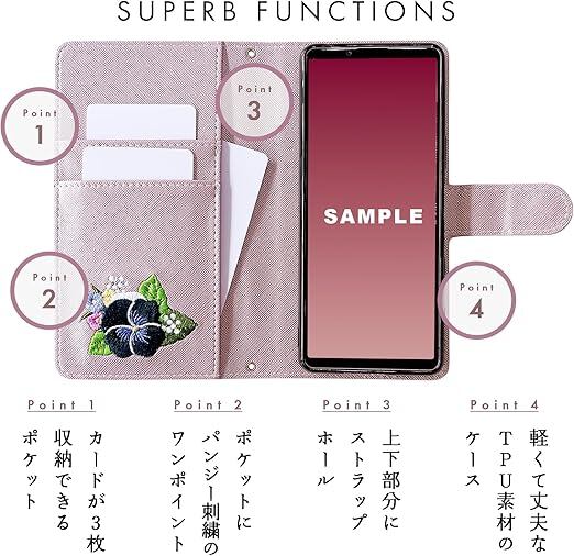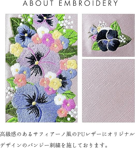 内側にはカードなどが収納できるポケット付きの、実用的なハンドあり手帳型ケースです。高級感のあるサフィアーノ調生地に華やかで上品なオリジナルデザインのパンジー刺繍を施しています。ストラップ穴付きのため、チェーンを付けたりストラップを付けることが可能となります。