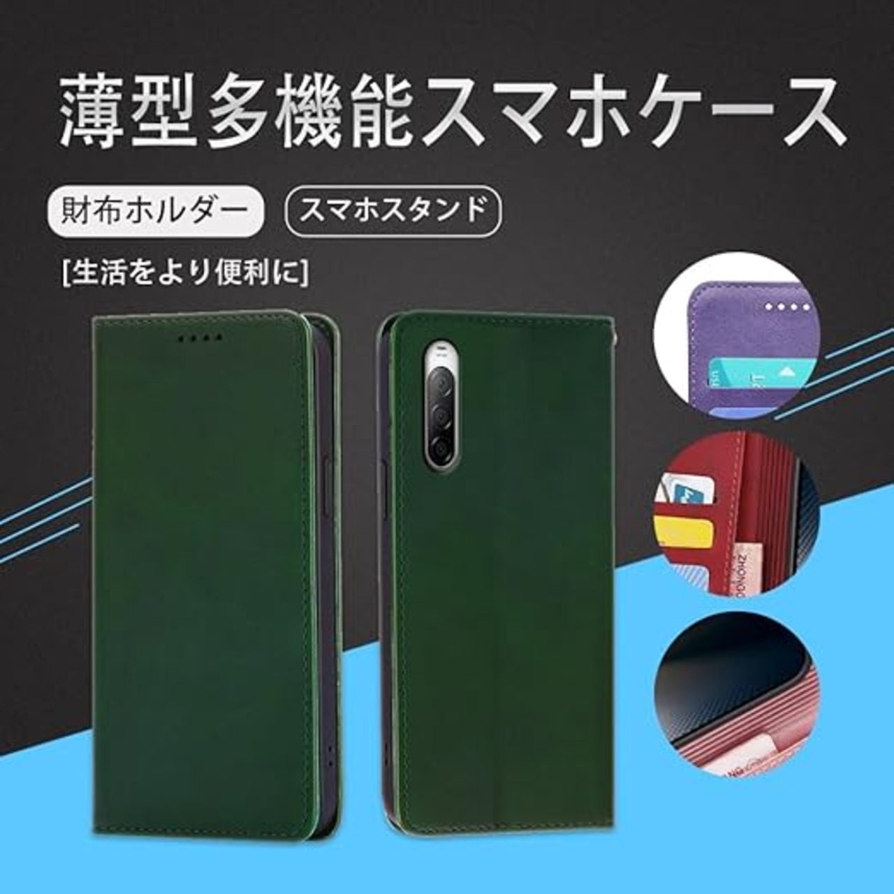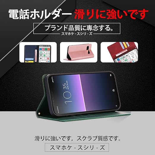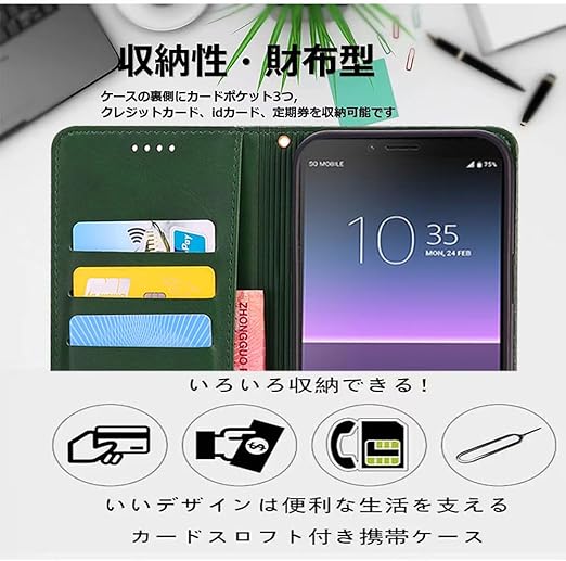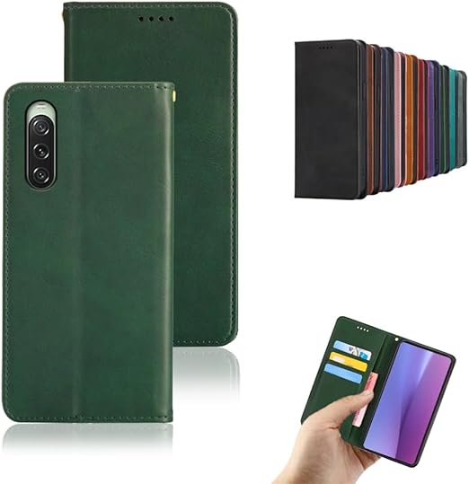 対応Xperia 10 V SO-52D SOG11 手帳型 シェルノートブックタイプ保護カバーノートブックカード収納側マグネットブラケット機能互換性のある耐衝撃性軽量モダンシンプルファッションPUレザー折りたたみ式フル保護カバー男性と女性のスマートフォンケース用(ダークグリーン) a