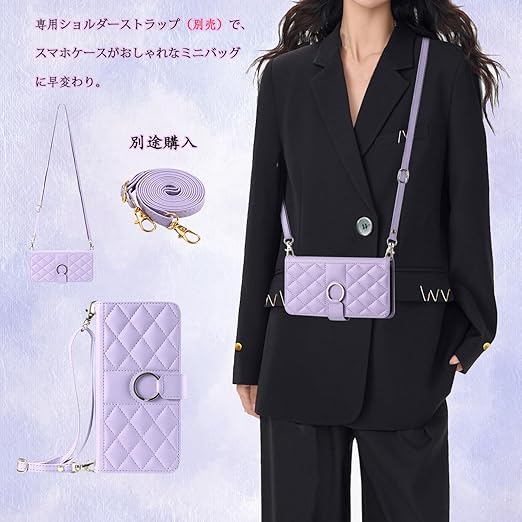淳一屋 Sony Xperia 10 V (SO-52D/SOG11)リング付きキルティグレザー調手帳型ケース エレガントでかわいい ストラップ付き 優れるカード収納力 スタンド機能 マグネット開閉 全面保護(パープル) a