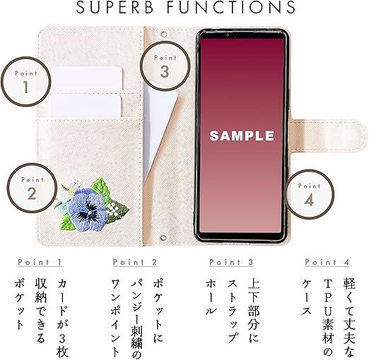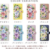 内側にはカードなどが収納できるポケット付きの、実用的なハンドあり手帳型ケースです。高級感のあるサフィアーノ調生地に華やかで上品なオリジナルデザインのパンジー刺繍を施しています。ストラップ穴付きのため、チェーンを付けたりストラップを付けることが可能となります。