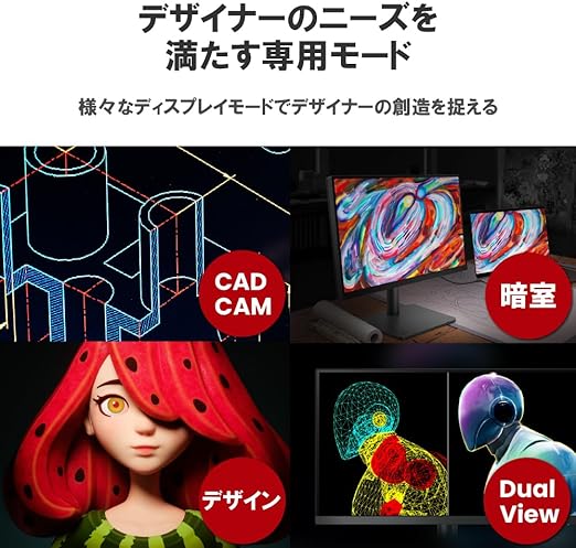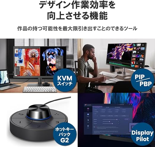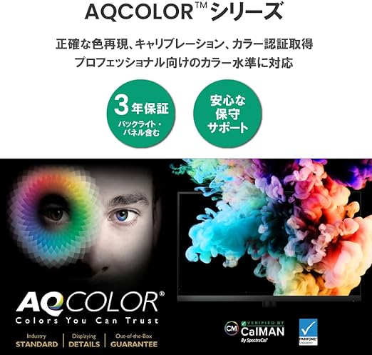 Display P3/DCI-P3 95%、sRGB/Rec.709 99%の広色域に対応し、10ビットカラーによる10億7000万色の色表現が可能。Pantone/CALMAN認証取得のAQCOLORシリーズで、出荷時キャリ