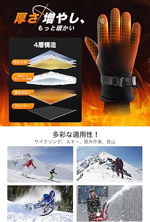 【4層構造防寒グローブ × 冷気を完全ブロック】防風・撥水加工のアウター層、保温性抜群の3Mシンサレート中綿、暖かい裏起毛、滑り止めPUレザーの4層構造を