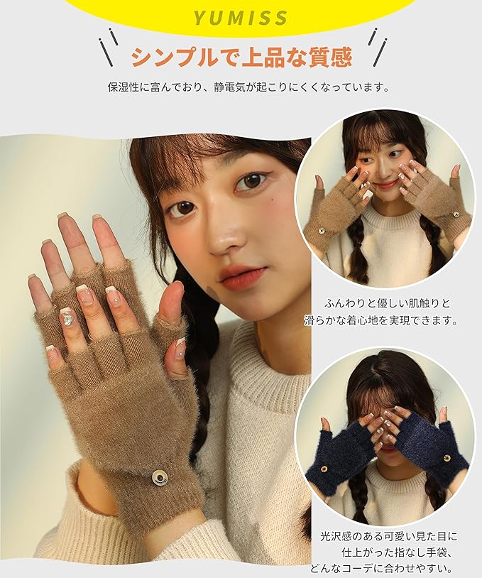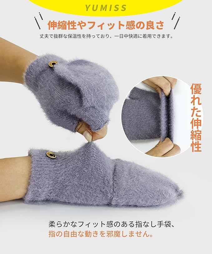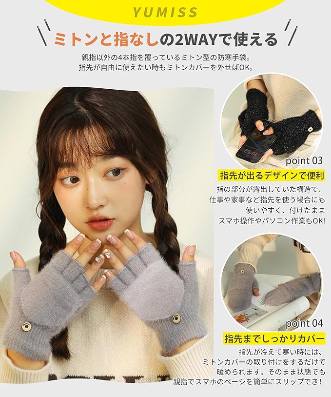 [YUMISS] 防寒手袋 指なし レディース 【2WAY仕様・超繊細保温蓄熱素材・ふわふわ柔らかな肌触り】 冬 スマホ対応 ミトン 保温 防風 柔らかい よい伸縮性 パソコン作業 自転車 アウトドア 指ぬき てぶくろ