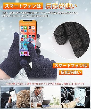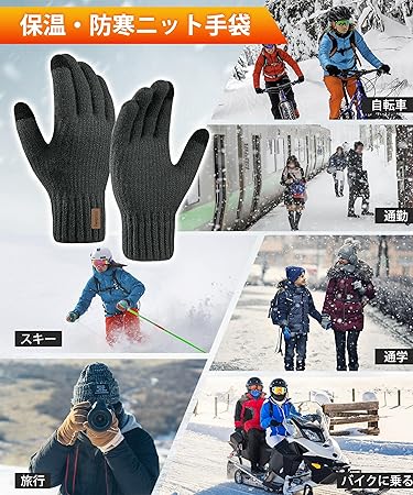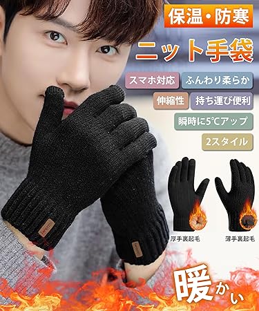 【商品説明】:HORADON 防寒 ニット手袋。素材:アクリル80% スパンデックス20%、2スタイル(厚手裏起毛、薄手裏起毛)、総長:約21cm、手の周り:18-23cm、季節:秋、冬、春、対象:男女兼用、洗濯:手洗いし、風通しの良い場所で乾燥させる。手袋 メンズ 冬、暖かい ニットグローブ、柔らかく肌に優しい素材で、寒い季節でも快適な着け心地を実現。スマホ操作にも対応しており、機能性も抜群です。保温性・防風性・耐久性に優れ、特に厳しい寒さの中でもしっかりと手を守ります。軽量でかさばらず、持ち