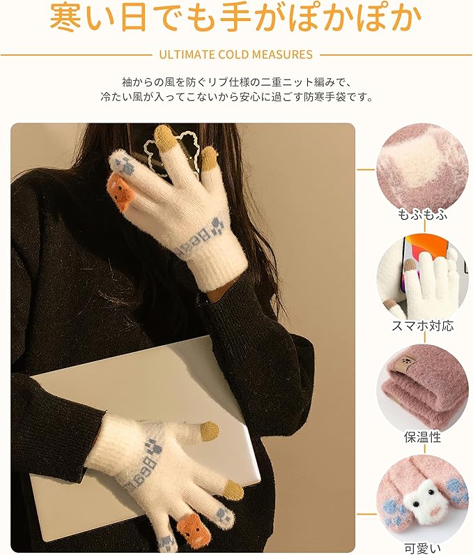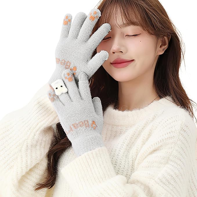 [Adcey] 手袋 レディース 防寒手袋 【寒い日でも手がぽかぽか・かわいい動物つめ柄・タッチパネル対応】 暖かい 保温 ニット手袋 スマホ対応 猫 かわいい 柔らかい もこもこ 伸縮性 5本指 グローブ 自転車 バイク アウトドア 通勤 通学 c