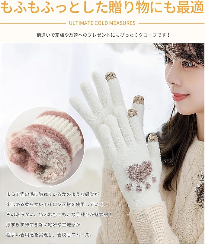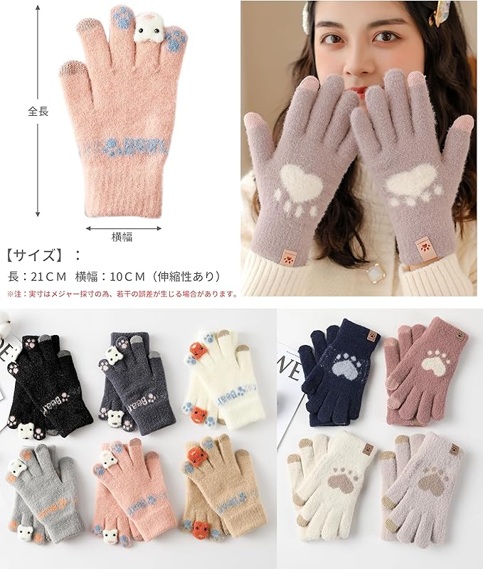 [Adcey] 手袋 レディース 防寒手袋 【寒い日でも手がぽかぽか・かわいい動物つめ柄・タッチパネル対応】 暖かい 保温 ニット手袋 スマホ対応 猫 かわいい 柔らかい もこもこ 伸縮性 5本指 グローブ 自転車 バイク アウトドア 通勤 通学