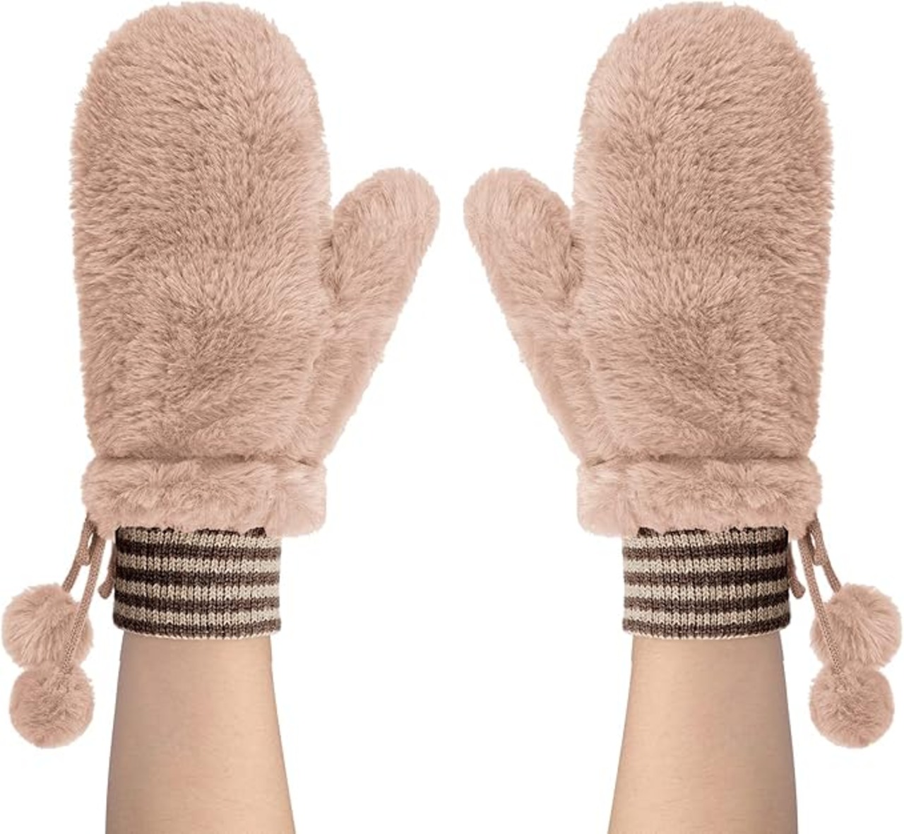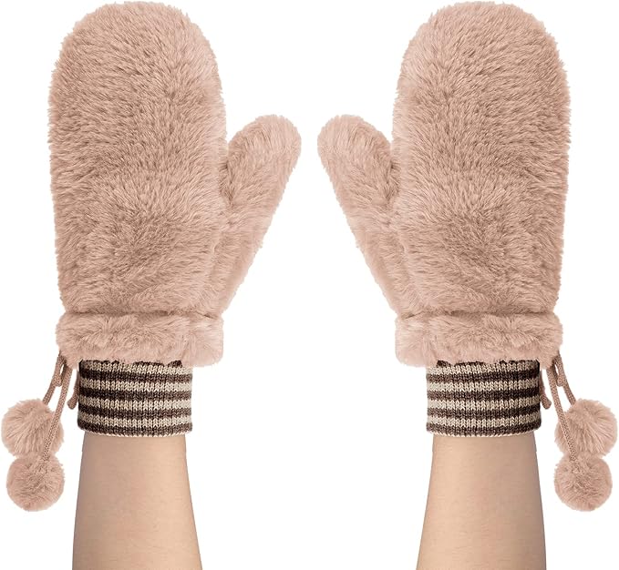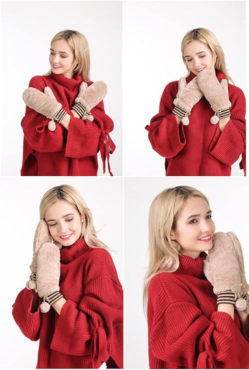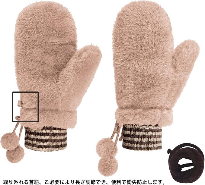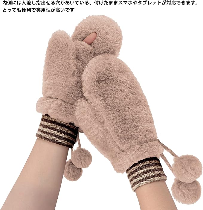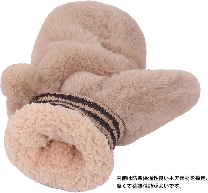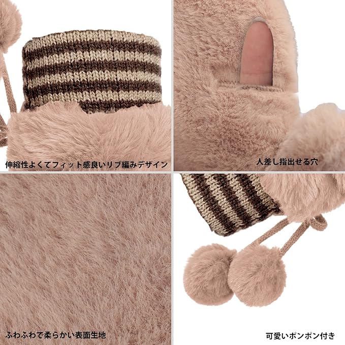 [FakeFace] レディース 手袋 ミトン 冬 ふわふわ 防寒手袋 グローブ スマホ対応 指だし手袋 可愛い ポンポン付き あったかグッズ 裏ボア素材 蓄熱 紐付きグローブ 無地 2層構造 学生 女性 通勤通学 お出かけ アウトドア c
