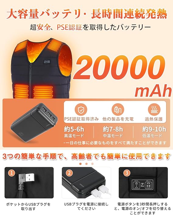 [PandaRio] 電熱ベスト ヒーターベスト 【超速暖 前後独立3段階温度制御】 大きいサイズ S-6XL 前後12箇所発熱 軽量 Vネック 20000mAh大容量バッテリー付き USB給電 丸洗い 屋外作業 男女兼用 40-120kg対応 a