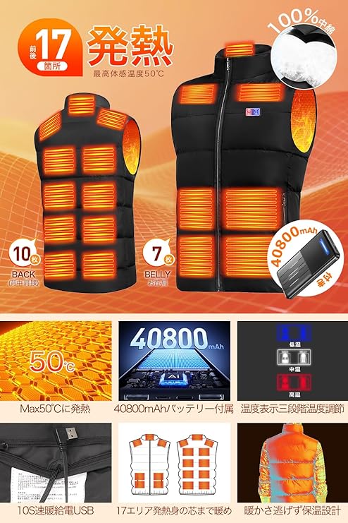 [Yoigood] 電熱ベスト 【40800mAh大容量バッテリー付き 17箇所発熱】 加熱ベスト 前後独立スイッチ 3段階温度調節 USB給電 ヒートジャケット 速暖 保温 メンズ レディース 加熱服 暖房ウェア 丸洗い 省エネ 通勤 通学 防寒対策