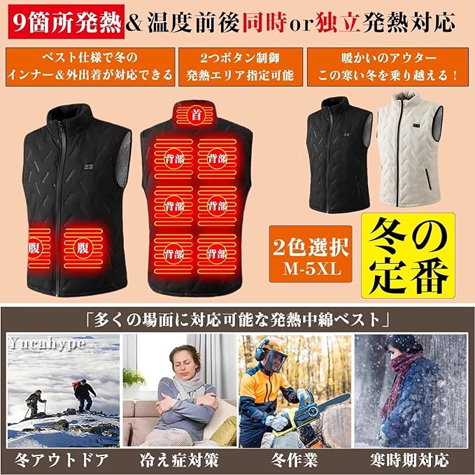 [Yucahype] 電熱ベスト 9箇所発熱 男女兼用 電熱インナー M-5XL 大きいサイズ USB前後温度独立制御 3段温度調節 おしゃれ ヒーターベスト ヒートテック 冬アウター 防寒用 バイク ゴルフ メンズ レディース
