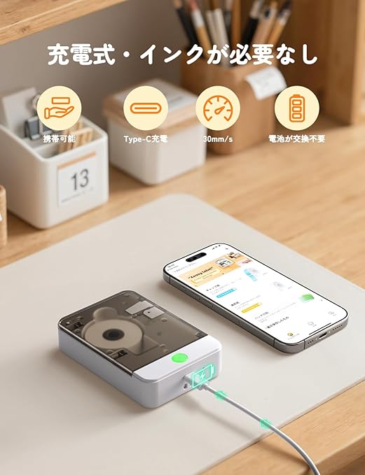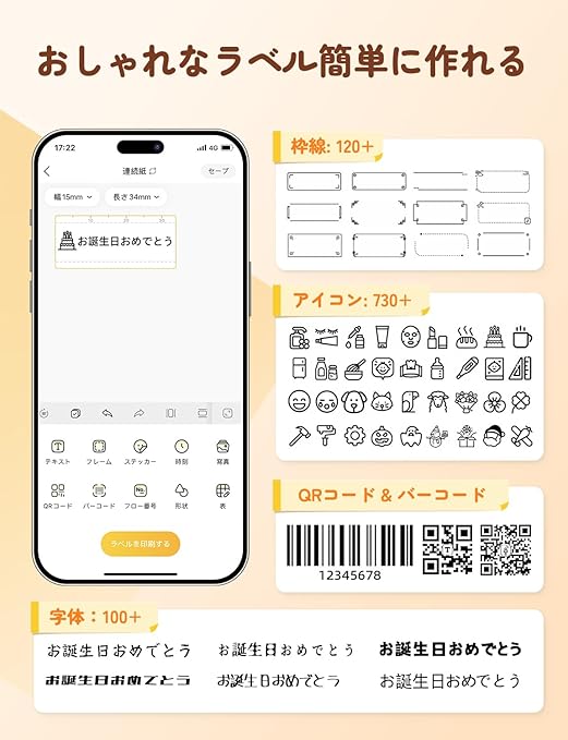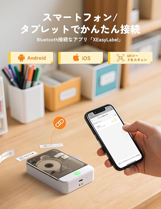 【スマートフォンとの連携】おしゃれなラベルを簡単に作って楽しめるラベルライターです。本体とスマートフォンをBluetoothで接続し、専用アプリを使って簡単にラベルが作成できます。専用アプリ「Xeasy Label」はアプリストアまたはQRコードからダウンロードできます。プリンター初心者でも扱いやすいです。