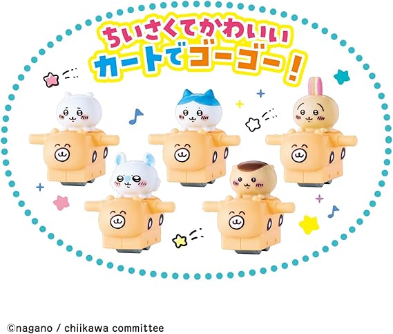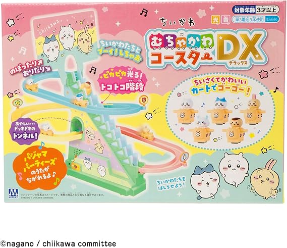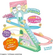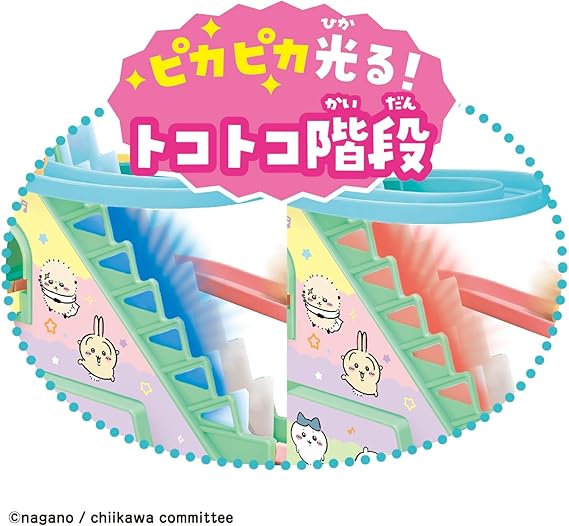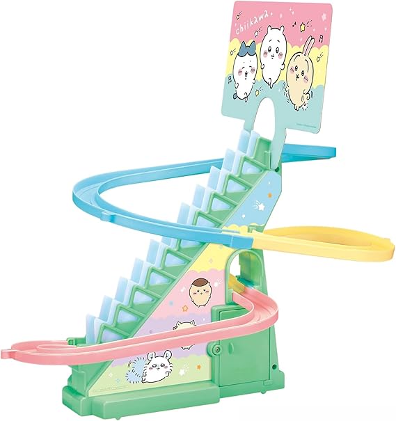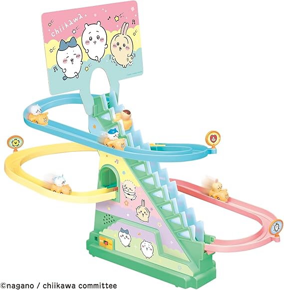 ちいかわ、ハチワレ、うさぎ、モモンガ、くりまんじゅうがかわいいカートに乗って階段をトコトコのぼり、コースを元気に走るコースターのおもちゃです。