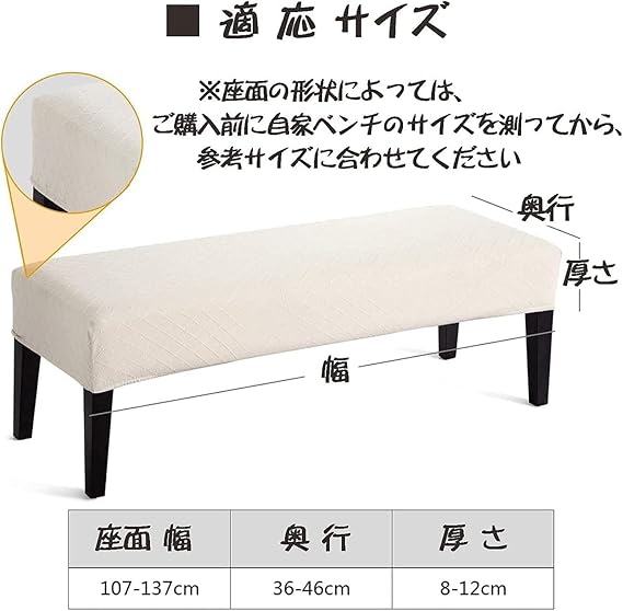 対応するベンチサイズ:座面幅約120-130cm、奥行約40-46cm、厚さ約5-12cm。ベンチシートカバーは手触りが柔らかく、薄くて通気性があり、シワになりにくく、防水、四季適用な素材感。ベンチに新しい外観を与えます、お気に入りのチェアを汚れや傷から守ります、長くお使いいただけます
