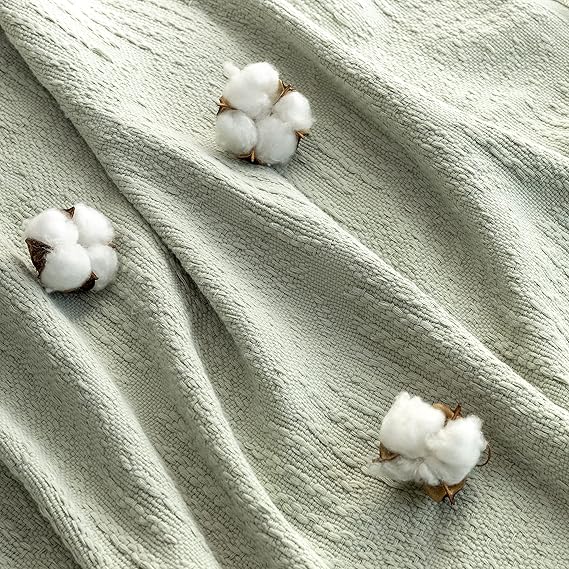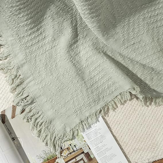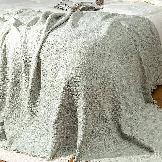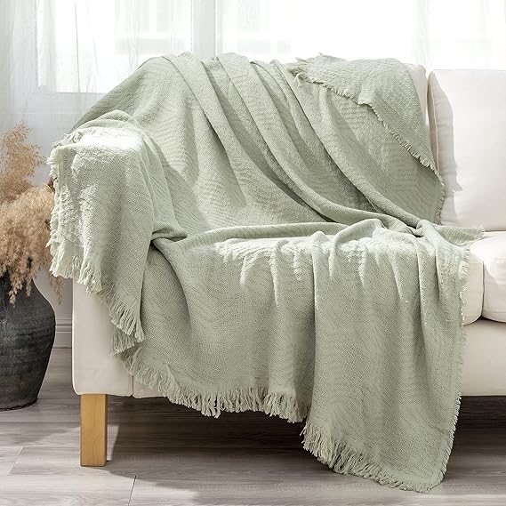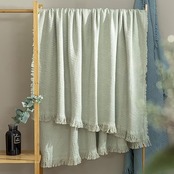 コットン100% スローブランケット フリンジタッセル付き ラップカバー ベッド/ソファ/リビングルームのソファ用、椅子50x60インチ、グリーン a