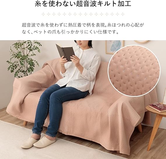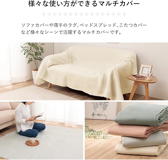 【商品紹介】生地はサラッとした肌触りで、季節を問わずオールシーズン使えるマルチカバー。ソファカバー、ベッドスプレッド、ラグカバー、こたつ布団の上掛けなど様々なシーンで活躍します。