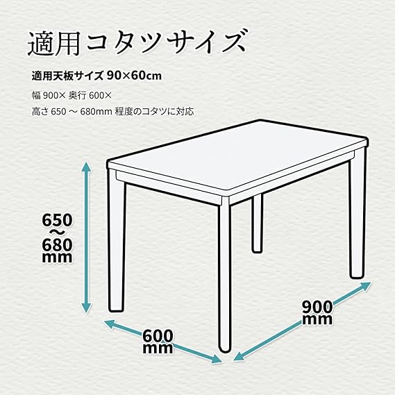 ハイタイプのダイニングこたつ用のこたつ掛け布団の単品です。幅90×奥行60×高さ65~78cm程度のダイニングこたつに対応しています。肌に当たる裏地は手触りのよいフランネル生地を使用、また中綿と一緒に保温性の高いアルミシートを挟み込むことで薄手で軽量ながら保温性の高いこたつ布団に仕上げました。両サイドには手元コントローラや携帯などの収納に便利なポケットが付属。収納場所を決めておけば使いたい時にすぐに使えます。