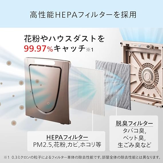 1.高性能HEPAフィルター採用。0.3ミクロンのハウスダストを99.97%除去。高性能HEPAフィルターが目に見えない小さなハウスダストを除去します。さらにフィルターをプリーツ状にすることで集じん面積を増加。目詰まりによる能力低下を防ぎ、集じん効果が持続します。