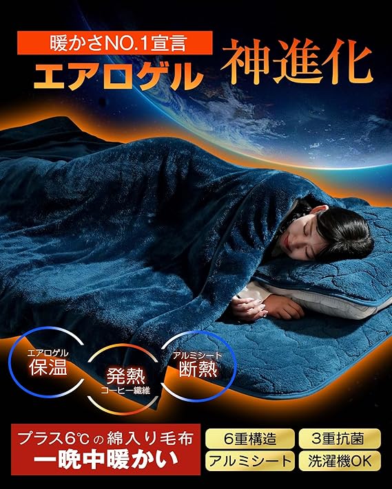 『2つの最先端テクノロジーで誕生、未来のあったか毛布』「21世紀に革命を起こす素材」として知られる「エアロゲル」は、宇宙服にも使用されている圧倒的な「断熱性」「軽量性」「通気性」「柔軟性」「耐久性」を誇る素材です。また、「次世代の夢のような素材」と称されるコーヒーファイバーは、天然の「吸湿発熱」「蓄熱保温」「遠赤外発熱」「永久消臭」の特性を持ち、環境にもやさしい素材です。これら2つの最先端素材を「毛布 冬用」に使用し、究極の暖かさと快適さを実現しました。私たちにとっては小さな一歩かもしれませんが