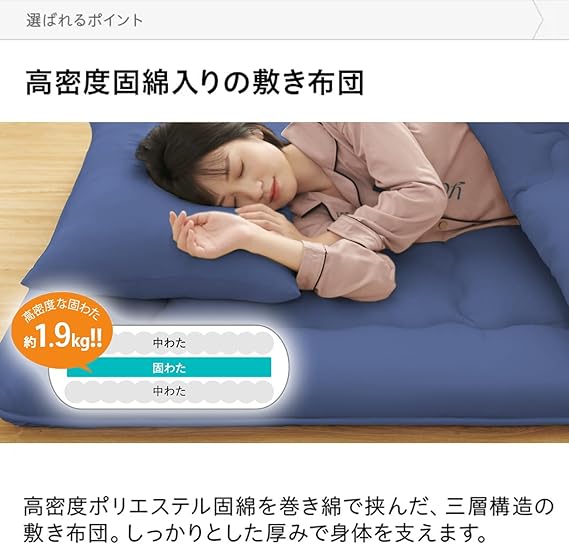 【 MS高反発固綿入り!フィット感抜群の敷布団 】この敷布団は、特許取得のMS高反発固綿を使用した3層構造を採用しています。高密度の生地で体を包み込むこと