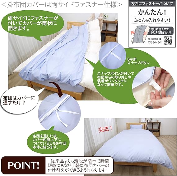 布団との留める部分は6ケ所スナップボタン、上下2ケ所ヒモ付き 。