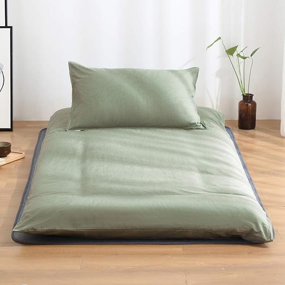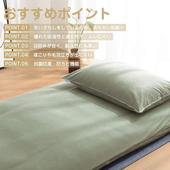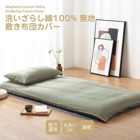 クモリ(Kumori) 敷き布団カバー シングル 綿100% 洗いざらし 敷き布団/マットレス対応 丸洗いOK 和式 敷きカバー 肌触り優しい 完全に保護 全開ファスナー 敷きふとんカバー 洗える 敷き布団シーツ シングル・105X215cm グリーン a
