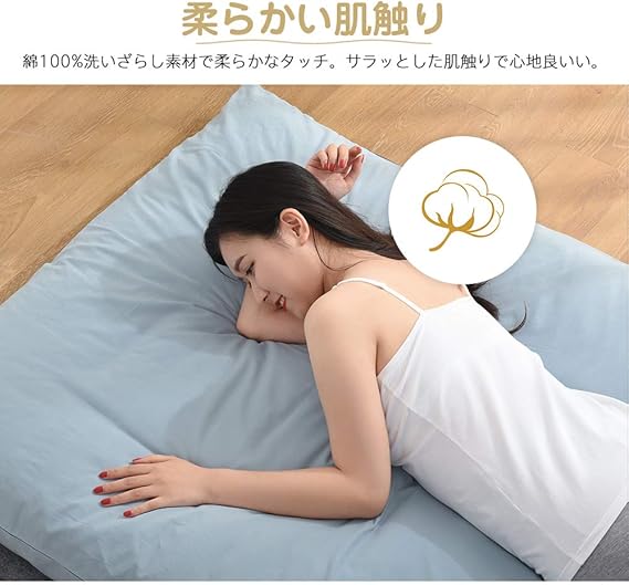 <洗いざらし綿100%>:肌触りが最高の上に、寝返りをしても、隅々まで柔らか触感を楽しめる使用感に意外とファンが多いです。毛玉やほつれができない、静電気も少ないため、肌触りの心地よさを実感していただけます。自分の快眠のために、また大切な方へのプレゼントとしても喜ばれます。