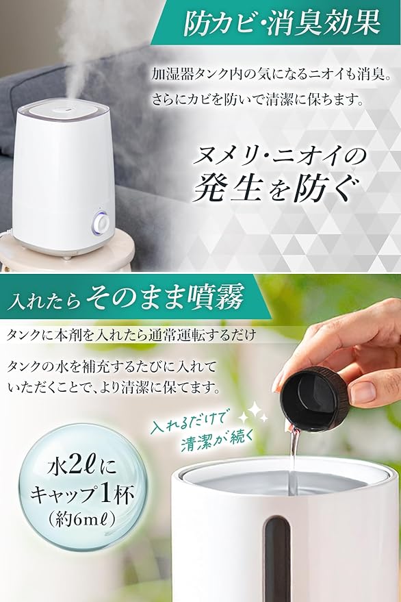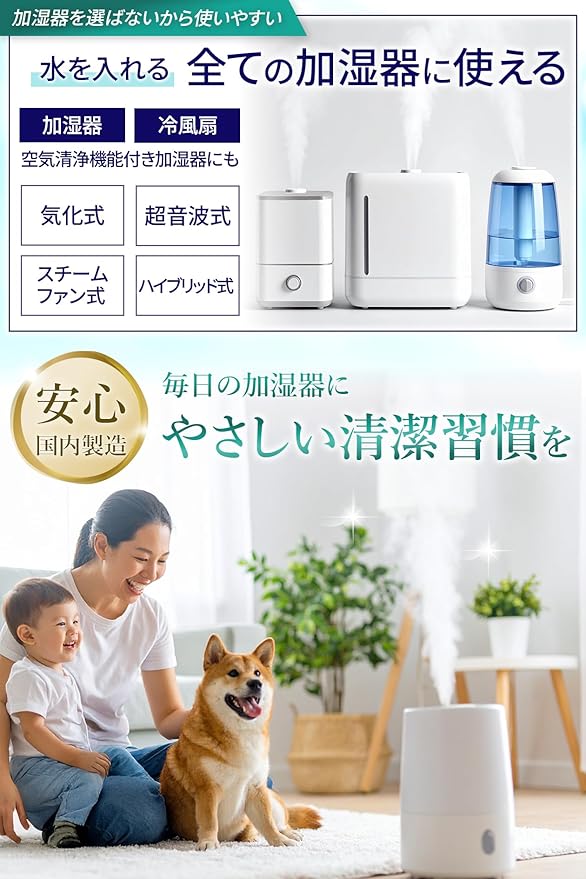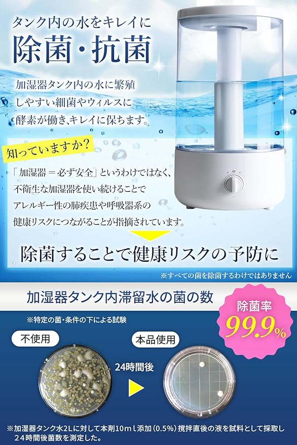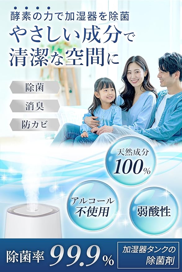 【酵素の力でしっかり除菌!加湿器タンクを清潔に保つ】天然酵素の働きで加湿器タンク内に繁殖しやすい細菌やウイルスをしっかり除菌!除菌率99.9%の高い効果で水をいつも清潔に保ちます。ヌメリやニオイの発生を防ぎ、加湿器内部の衛生状態をキープ。超音波式・気化式・ハイブリッド式など、すべての加湿器に使用可能です。手軽に入れるだけで、安心の加湿環境を実現します。