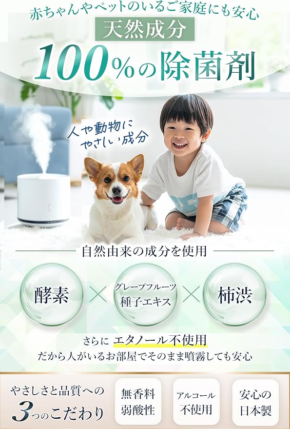 【天然成分100%の赤ちゃん・ペットにもやさしい除菌剤】人や動物へのやさしさを追求し、エタノール不使用のうえ、グレープフルーツ種子エキスや柿渋な
