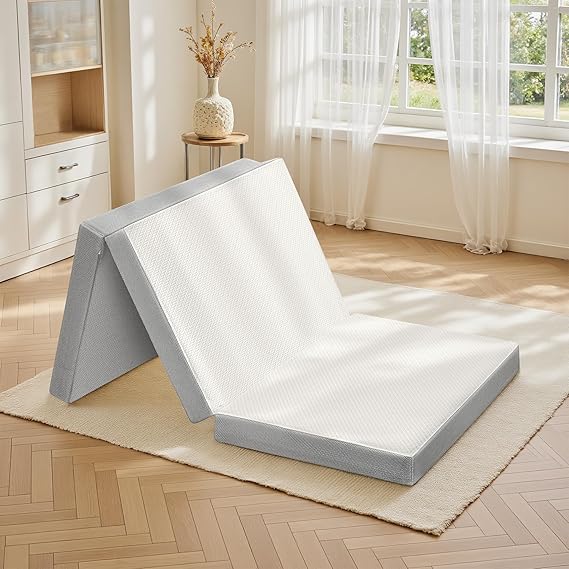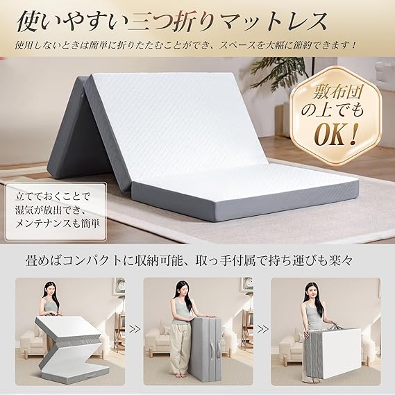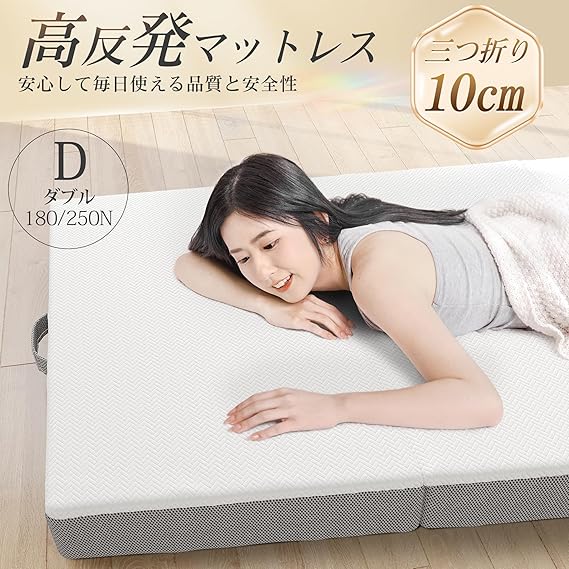 マットレス シングル 3つ折り- ATOPEN 高反発マットレス 極厚10cm 折り畳みマットレス 密度32D 硬さ180N/250N 2層構造 洗えるカバー 竹炭消臭 敷布団 97x195x10cm ホワイト a