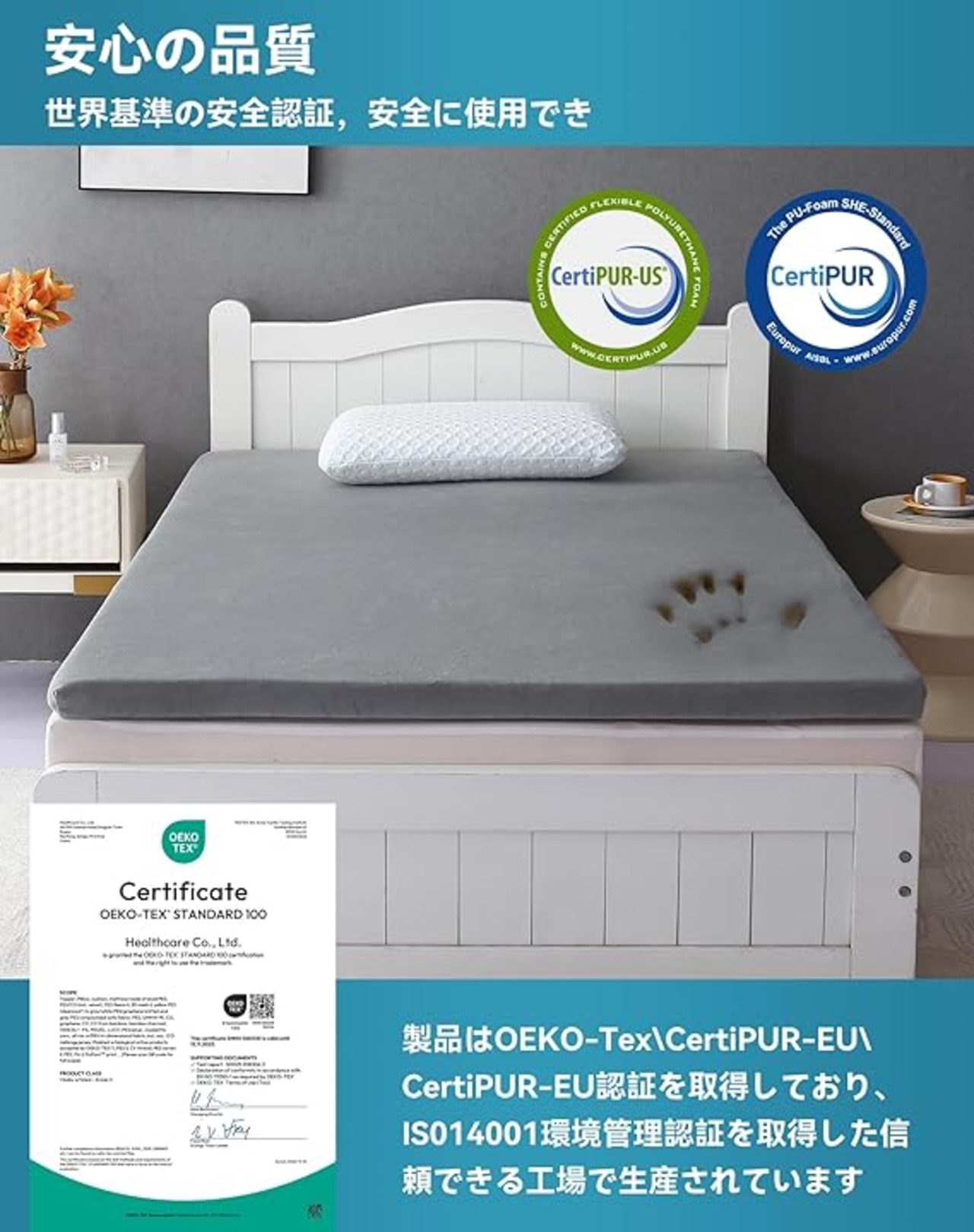 【安全認証】 当社のマットレス高反発の素材は柔らかく快適で、「CertiPUR-US」および「OEKO-Tex」の認証を取得しています。ポリウレタン特有の臭いがありますが、体に害はありません。寝具としての快適性と信頼性を備えたマットレスが、皆様の良質な睡眠をお届けすることを願っております。