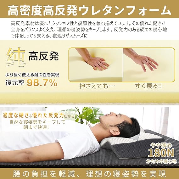【腰の悩みから解放】MyeFoamの高反発マットレスは優れた反発力(180N 高反発)が特徴で、腰の沈み込みを防ぐ。腰回りも下から持ち上げるように支えて心地良い寝姿勢をキープしてくれます。反発力のある硬めの寝心地で体をしっかり支える、寝返りが打ちやすく就寝時の腰にかかる圧力もかかりません。適度な硬さ&優れた反発力だから、今までのマットレスで背中や腰が沈んでしまって寝にくいといった経験がある方にもおすすめです。皆様のおかげさまでこちらの商品は【Amazon本当の5つ星商品】が当選されました。また、