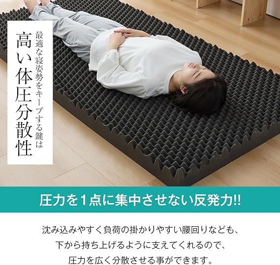 【10cmの高反発ウレタンで底付き感を出さない】当店の高反発マットレスは、厚さ10cmの高密度ウレタンを使用しています。床に直接敷いても底付き感がなく、しっかりとしたクッション性を持つ10cmの厚みに設計。厚みのあるウレタンが体をしっかり支え、寝返り時の
