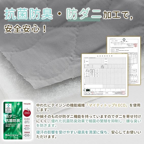 【抗菌防臭・防ダニ中綿使用】マイティトップⅡ中綿を使用し、SEK認証された優れた抗菌防臭効果で、細菌の繁殖を防ぐ抗菌・いやなに臭いを抑えます。通常の繊維と比べて、洗濯耐久性を実現しています。オールシー
