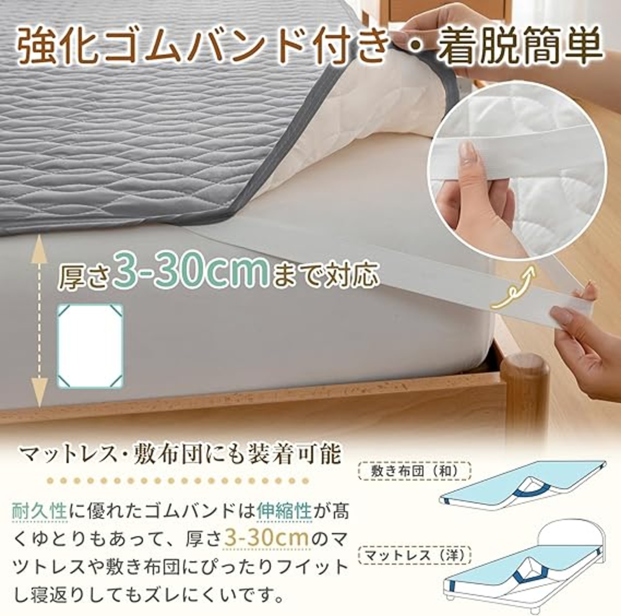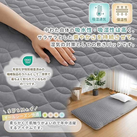 【お肌が喜ぶやさしい心地】肌に優しい表地は通気性がよく、汗をかいても水分が素早く吸収し、すぐに乾きます。汗をかきやすい夏も快適な使い心地。吸水性と通気性に優れた素材のため、敷きパッドは汗などの水分をたっぷり吸収し、速乾してさらっと快適にお使いいただけます。蒸し暑い夏や、季節の変わり目に活躍します。