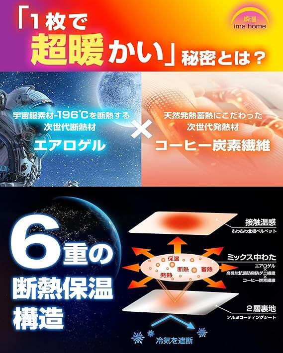 『2つの最先端テクノロジーで誕生、未来のあったか敷きパッド』「21世紀に革命を起こす素材」として知られる「エアロゲル」は、宇宙服にも使用されている圧倒的な「断熱性」「軽量性」「通気性」「柔軟性」「耐久性」を誇る素材です。また、「次世代の夢のような素材」と称されるコーヒーファイバーは、天然の「吸湿発熱」「蓄熱保温」「遠赤外発熱」「永久消臭」の特性を持ち、環境にもやさしい素材です。これら2つの最先端素材を冬用敷きパッドに使用し、究極の暖かさと快適さを実現しました。私たちにとっては小さな一歩かもしれま
