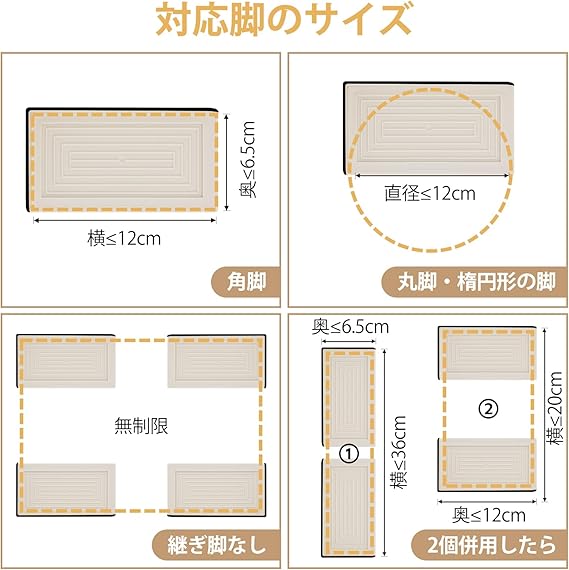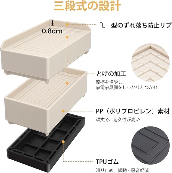 【家電・家具高さ調整器具】この継ぎ足しは積み重ね可能なブロック型で、家具や家電製品などの用途に合わせて高さを調節でき、ちょうどよい使い心地が得られます。嵩上げ高さが4センチ、7.3センチとなります。上段と中段はPP(ポリプロピレン)の素材で、頑丈的で耐久性が抜群です。下段はTPU(ゴム)が採用され、滑り止め加工で耐摩耗性が高いです
