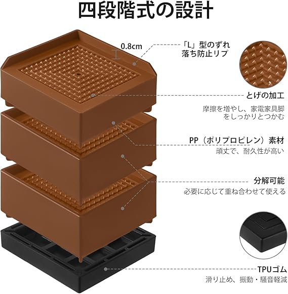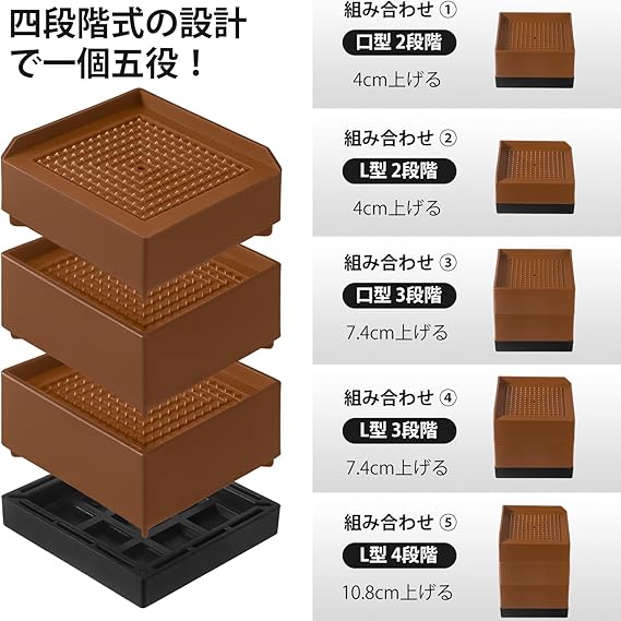 テーブル 高さ調整 机 10.8-7.4-4センチ かさ上げ こたつ 足 テーブル 脚 継ぎ足し ベッド ソファー そこあげ こたつの高さを上げる足 家具・家電 高さ調整器具 滑り止め 掃除しやすい 耐荷重1000kg 4個セット(ブラウン 四段式) a