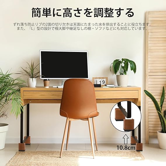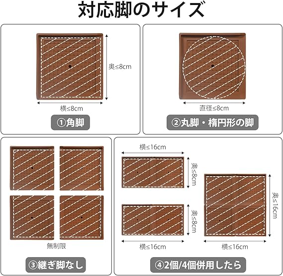 【かさ上げに】テーブル脚やコタツ足などの継ぎ足しです。こたつや座卓の各脚に本品をはめ込み、高さに4センチ・7.4センチ・10.8センチ上げると、 寝転がっても腰が当たらずらくらく。洗濯機や棚をかさ上げたら、モップ・クイックルワイパー・ロボット掃除機が入るのでホコリ取りには問題ないです。さらに、ベッド・ソファーを高くしたら収納スペースを拡大することもできます。