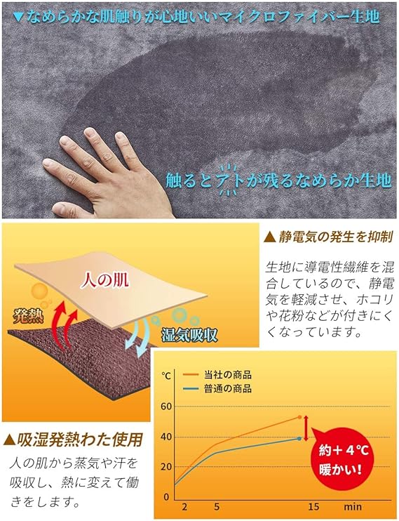 【マイクロファイバー】:マイクロファイバーよりもさらに細い繊維を使用し、やわらかな風合いと、なめらかな肌ざわりがさらにアップ!ほどよく暖かい空気を含んでくれますので、保温性が高くなっています。
