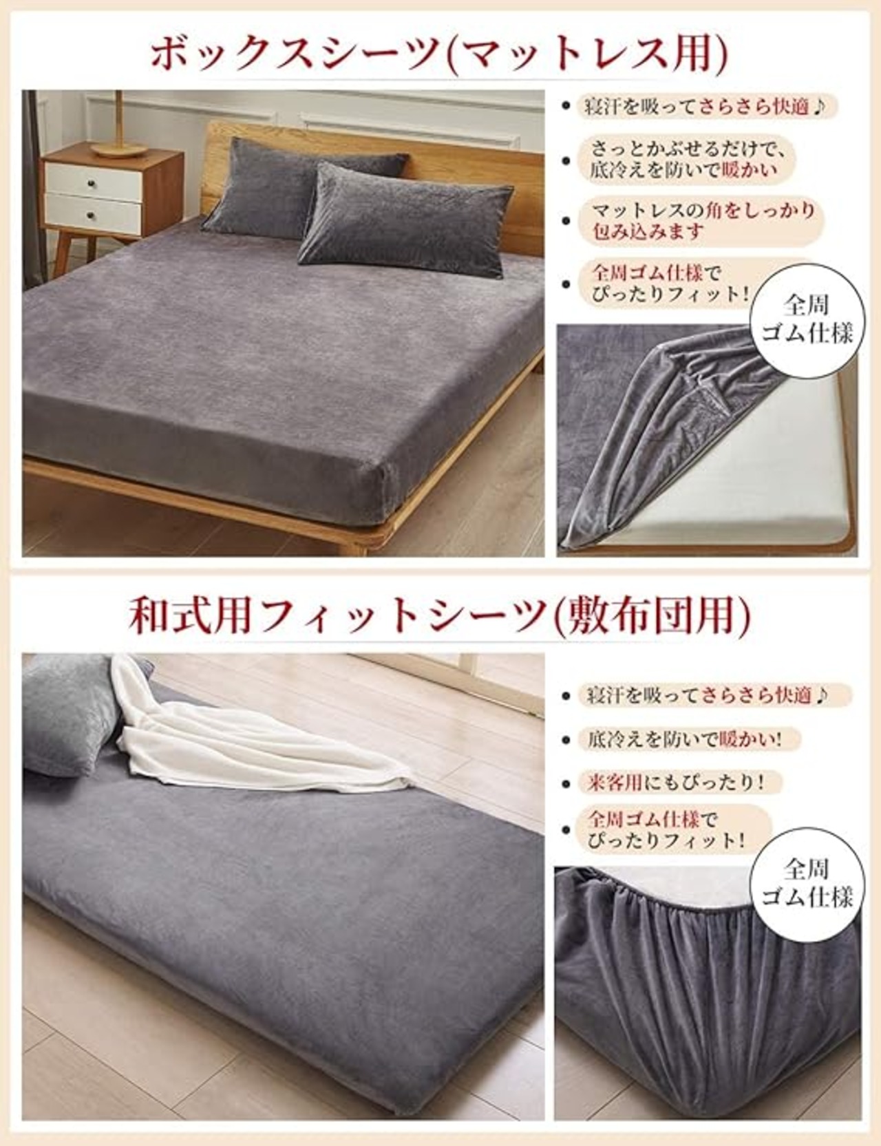 【ボックスシーツのサイズ】:ダブル・100×200×マチ30cm 全周ズレ防止ゴム付き、着脱が簡単なボックスタイプです!