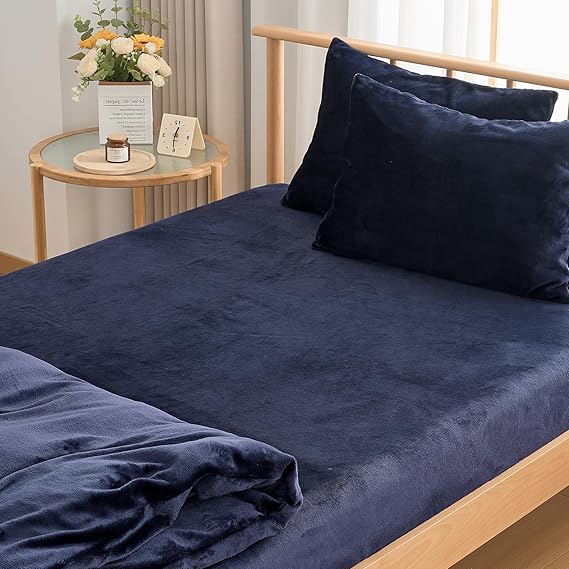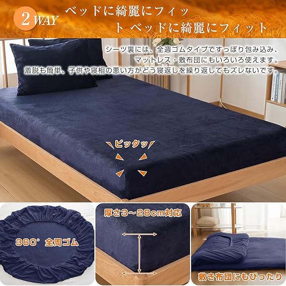 fuwawa ボックスシーツ シングル 冬 ベッドシーツ フランネル 暖かい 厚手 『プラス5℃蓄熱保温』吸湿発熱 冬用 防寒対策 ベッドカバー【CICA保湿加工・防ダニ99.9%・エッコテックス認定】抗菌防臭加工 全周ゴム付き 静電気防止 丸洗いOK 着脱簡単 マットレスカバー あったかシーツ 敷ふとん兼用 マチ部分約30cm(シングル・100×200cm ネービー) a