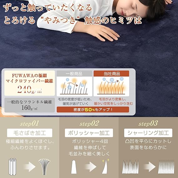 【とろけるような肌触り】肌触りを決めるのは、毛足の長さと細かさです。fuwawaボックスシーツは表裏とも220g/㎡高密度極細フランネル素材を採用、きめ細かい繊維はみっちり詰まっているからふ