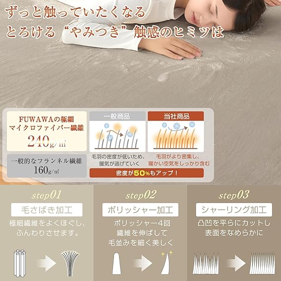 【とろけるような肌触り】肌触りを決めるのは、毛足の長さと細かさです。fuwawaボックスシーツは表裏とも220g/㎡高密度極細フランネル素材を採用、きめ細かい繊維はみっちり詰まっているからふ