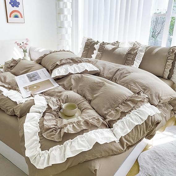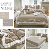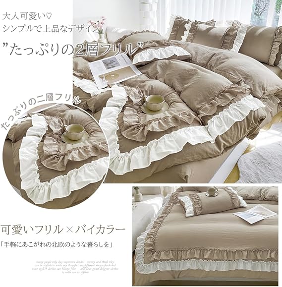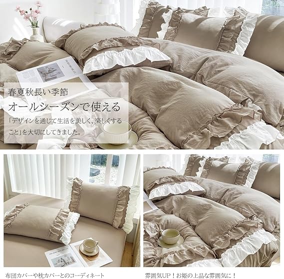 布団カバー 3点セット 2層フリル布団カバー 寝具カバー 洋式・和式兼用 ベッドカバー 掛け布団カバー ボックスシーツ 枕カバー シーツカバー 肌に優しい ピーチスキン加工 北欧風 オールシーズン(シングル、カッキーベージュ) a
