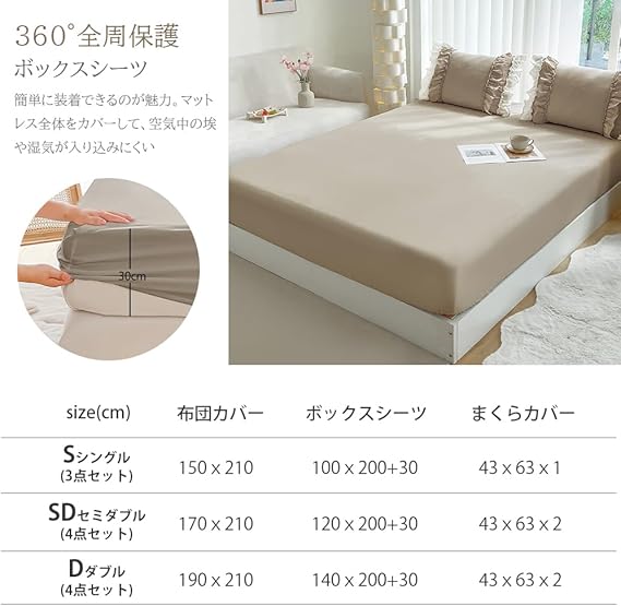 【商品仕樣】シングル 3点セット 掛け布団カバー(1枚)、150X210cm ・ボックスシーツ 100X200+30cm 枕カバー(1枚) 46X63cm セミダブル 4点セット内容と仕様 掛け布団カバー(1枚)、170X210cm ・ボックスシーツ 120X200+30cm 枕カバー(2枚) 46X63cm ダブル 4点セット 掛け布団カバー(1枚)、190X210cm・ボックスシーツ 140X200+30cm 枕カバー(2枚) 46X63cm
