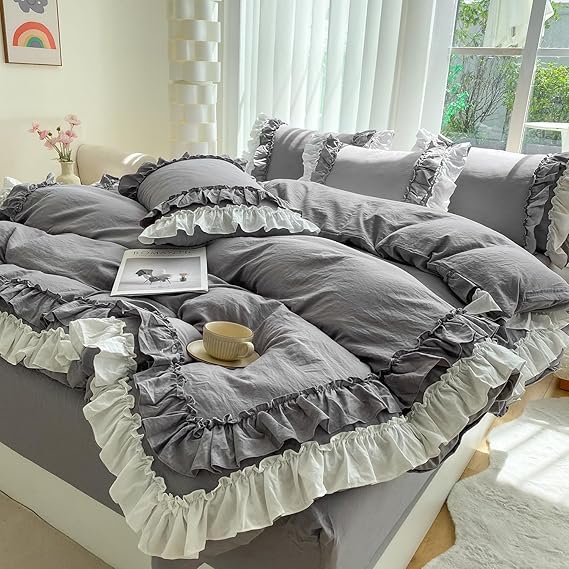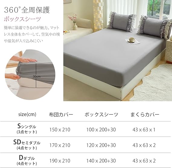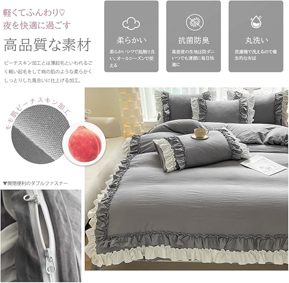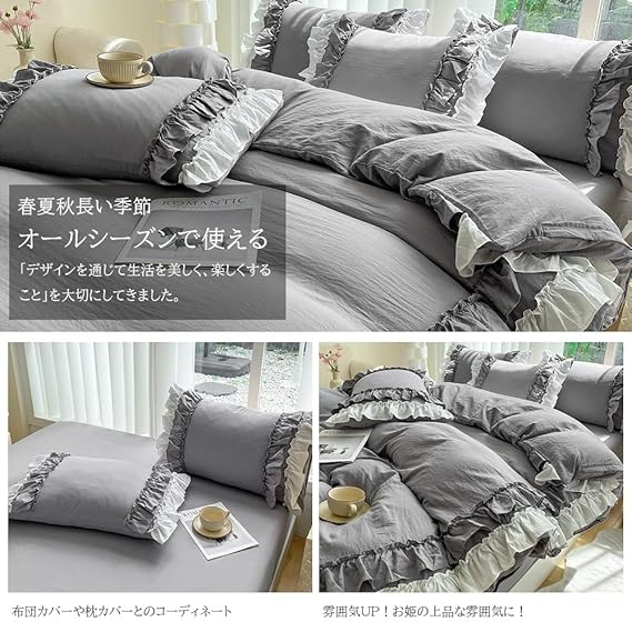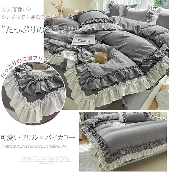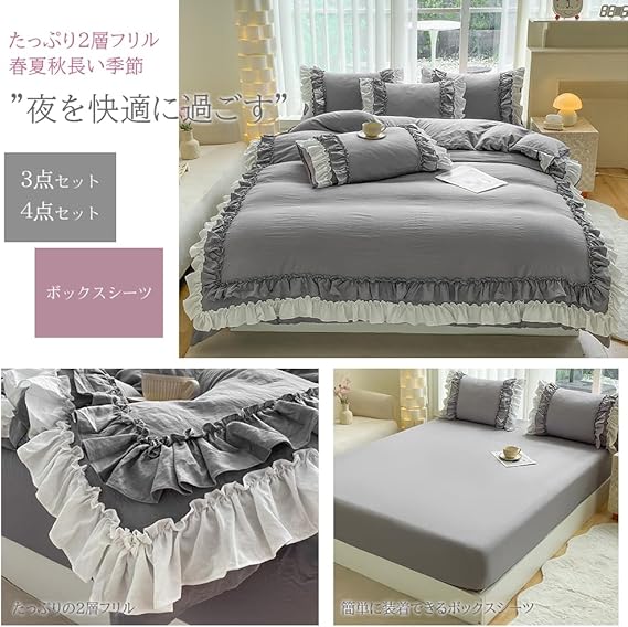 布団カバー 3点セット 2層フリル布団カバー 寝具カバー 洋式・和式兼用 ベッドカバー 掛け布団カバー ボックスシーツ 枕カバー シーツカバー 肌に優しい ピーチスキン加工 北欧風 オールシーズン(シングル、グレー) a