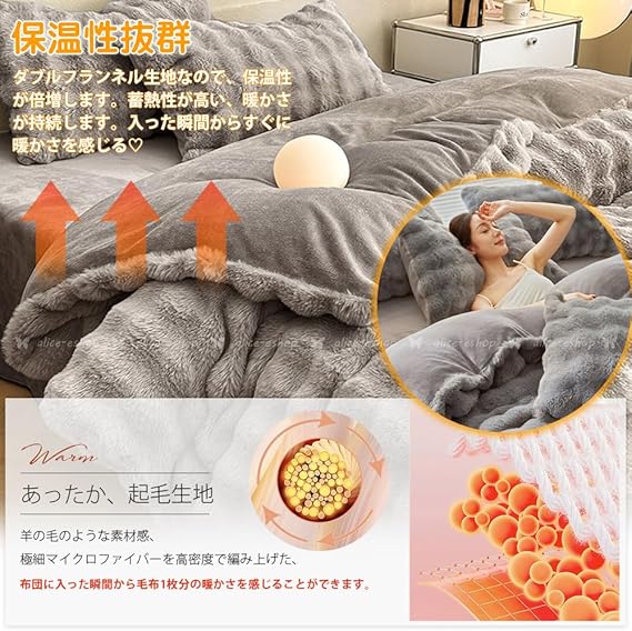 【極上暖かい&ラビットファー調加工】ポコポコ表面はラビットファー調の特殊素材を使用し、保温性が抜群、冬の冷えた空気の中でも優しく暖かい使い心地です。うさぎの毛皮のように柔らかくふわふわで、厚みがあるので、布団を中に入れず毛布としても使用可能。裏地はフランネル ( 極細マイクロファイバー)で編み上げた、入った瞬間からすぐに暖かさを感じる事ができます。冬の寒い時期には欠かせない一品です。