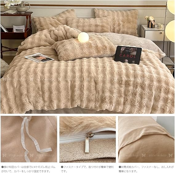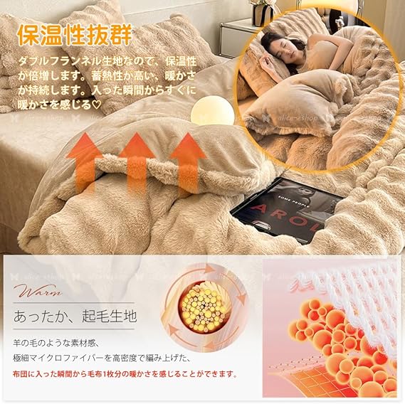 【極上暖かい&ラビットファー調加工】ポコポコ表面はラビットファー調の特殊素材を使用し、保温性が抜群、冬の冷えた空気の中でも優しく暖かい使い心地です。うさぎの毛皮のように柔らかくふわふわで、厚みがあるので、布団を中に入れず毛布としても使用可能。裏地はフランネル ( 極細マイクロファイバー)で編み上げた、入った瞬間からすぐに暖かさを感じる事ができます。冬の寒い時期には欠かせない一品です。