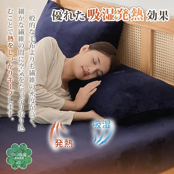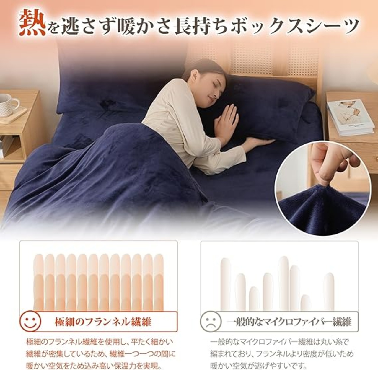 【あったか接触温感&蓄熱保温機能】本品の冬用ボックスシーツは高密度プレミアムフランネル生地を採用しています。マイクロファイバーが高密度に詰まっており、毛足に空気を多く包み込んでいるため、暖かい空気をしっかりと閉じ込め、蓄熱保温性に優れています。布団に入った瞬間、ふわふわぽかぽかな暖かさに包まれます。肌寒い秋冬に欠かせないアイテムになります。